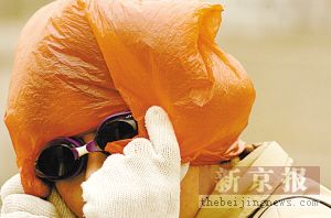 昨日10時,一位路人頭罩塑料袋遮蔽突如其來的風沙。實習生 李強 攝