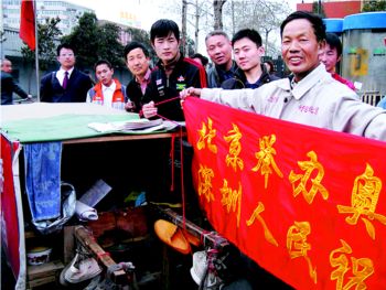 “我一路上心情好,邊走邊唱,最多一天能趕40多公里,”李蔭桃告訴記者,即使路遇南方雪災被困湖南時,他也在救助站里為被困的人們唱了4天歌。李蔭桃說,他明天要去天安門看升國旗儀式,再親手將寫有“北京舉辦奧運會,深圳人民祝福您”的紅色橫幅送給北京奧組委!斑^兩天就坐火車回老家了,老婆孩子掛念我太久了。”