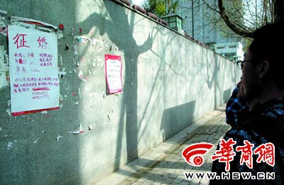 26日,在西安市西影路某大學校園內的超市墻上,貼著一張征婚啟事,其中對應征者的特殊要求更是引來不少人圍觀!罢骰槿耍河嗄常挲g:20,身高:1米65,相貌端正,體態輕盈,能歌善舞。此人現征男友一名,不限身高,不限年齡,不限家庭背景,要對得起觀眾,有意者請撥打:……(兩個手機號碼)”“對得起觀眾是什么要求?我覺得我長得就對得起觀眾!蹦袑W生們交頭接耳地議論,女生則大多看后轉身走開,還有同學發出了“神經病”的感慨。