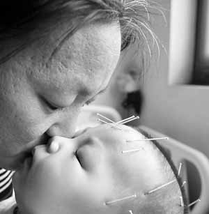 昨天上午,記者見到劉一鳴時,她正在河南中醫學院一附院做針灸治療。小小的腦袋上插了20多枚針,她的媽媽怕針移位,一直保持一個姿勢抱著女兒(如圖)。