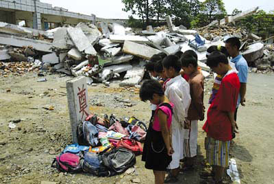 “5·12”地震發生后,四川德陽什邡市一名從廢墟中爬出來的13歲小孩,曾英勇救出3名同學和一名懷孕教師。昨天,該少年來到學校倒塌的校舍里刨出10余個書包,將它們整整齊齊地擺放在廢墟旁邊一塊寫有“奠”字的碑前,然后與其他同學一道默哀3分鐘,以此方式來陪伴遇難的同學一起過兒童節。