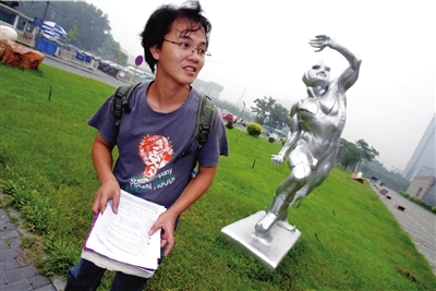 昨天上午9點40分,黎俊來到清華美院。深灰色T恤、卷邊牛仔褲、磨舊了的背包,剛下火車的黎俊看上去很有些風塵仆仆的味道。