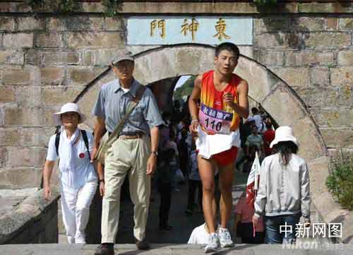 與往年相同,今年的登泰山比賽依舊分青年組、中年組、老年組三組。比賽從上午8:30同時(shí)開(kāi)始,三組分別以泰山之巔——玉皇頂、南天門(mén)和中天門(mén)作為終點(diǎn)。與登山運(yùn)動(dòng)員們幾乎同一時(shí)間向山頂出發(fā)的記者,一路悠哉悠哉的坐車(chē)到中天門(mén),再坐纜車(chē)到南天門(mén),然后不緊不慢的朝著玉皇頂進(jìn)發(fā)。突然,一個(gè)很是熟悉的影子從身邊輕巧的掠過(guò),又快速的向前沖去。原來(lái),排在青年組第一名的山東小伙子居然已經(jīng)超過(guò)一路坐車(chē)走捷徑的記者,向著終點(diǎn)玉皇頂沖刺了。