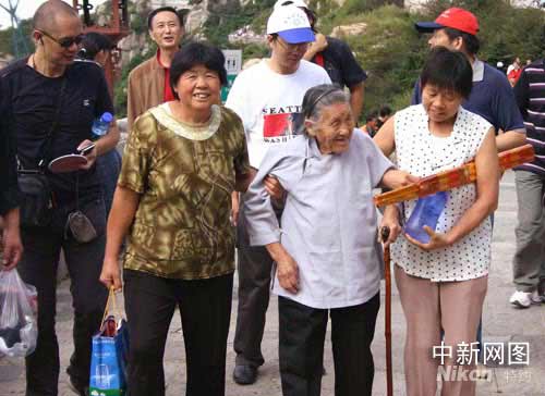 圖為來(lái)自山東聊城的九十一高齡的老奶奶在家人的攙扶下從南天門(mén)一步步走向泰山之巔。攝影 張璐