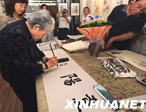 人們在展廳欣賞陳顯華老人(前左一)現場創作書法作品(新華社記者 譚進 攝)