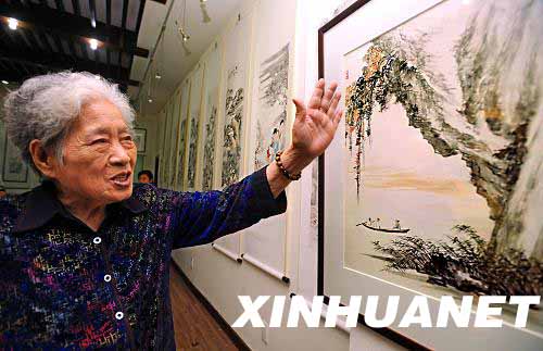 陳顯華老人在向觀眾介紹自己的山水畫作品(新華社記者 譚進 攝)