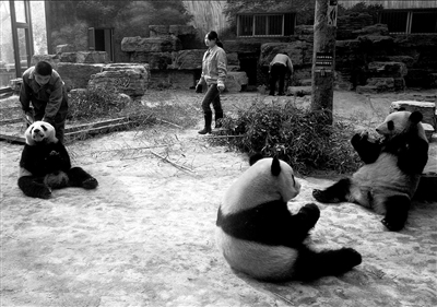 北京冬末的兩場雪,讓從沒見過雪的小家伙們格外興奮,本來還擔(dān)心它們不習(xí)慣北京的冬天,但沒想到熊貓們竟然很快學(xué)會和飼養(yǎng)員“打雪仗”!拔覀兌己芟爰伊,它們肯定一樣!痹陔x川9個(gè)月之后,大熊貓和飼養(yǎng)員都不再“樂不思蜀”。