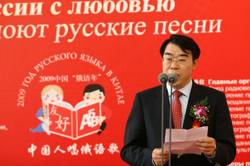 國際在線消息:(記者 衛寧)2009年5月26日,由國家廣播電影電視總局主辦,中國國際廣播電臺、中央人民廣播電臺、北京電視臺聯合承辦的“情動俄羅斯——中國人唱俄語歌大型選拔活動”在北京俄羅斯聯邦駐華使館舉行了盛大的啟動儀式和新聞發布會。教育部副部長郝平、外交部副部長李輝、國家廣電總局副局長田進、中國人民對外友好協會會長陳昊蘇、俄羅斯駐華大使拉佐夫和中國國際廣播電臺臺長王庚年以及活動各大分唱區承辦方代表、中俄兩國媒體記者和俄語界、文藝界代表等150余人共同出席了啟動儀式和新聞發布會。