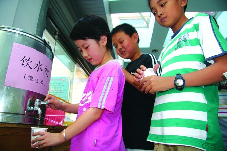 24日,經七路第一小學為學生準備了綠豆湯。靳鑫 徐潔 攝影