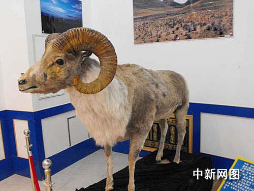 阿克塞哈薩克族自治縣縣委宣傳部熱提劍今日向記者介紹,該縣展覽館陳列的盤羊標本是國家二級保護動物,屬牛科中體型最大的一種,棲息于海拔2000——5000的沙漠和山地交界的沖擊平原和山地低溝中。雄性角粗大,由頭頂向下并向后螺旋狀彎曲,幾乎可達360度,主要分布在阿克塞哈薩克族自治縣境內于大、小哈爾騰前山和安南壩地區。