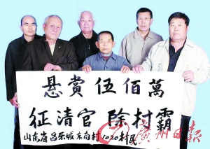 日前,山東昌樂縣城關(guān)街辦東南村6名村民在天涯論壇上發(fā)帖《懸賞五百萬 征清官 除村霸》,帖子稱,2000年本村村民因不滿村委20年的財(cái)務(wù)賬目不公開,要求清查村賬,經(jīng)過半年的清賬和查證,發(fā)現(xiàn)以村支書卞長智為首的村官們侵占集體資金和財(cái)產(chǎn)5000多萬元的犯罪事實(shí)。但多年的上告均未有具體處理結(jié)果,他們稱希望“征清官 除村霸”,誰能幫助他們討回5000萬集體資產(chǎn),愿意提供500萬懸賞,還稱是得到了1020名村民簽名允許。對此,東南村委工作人員回應(yīng)稱“這是誣告”。