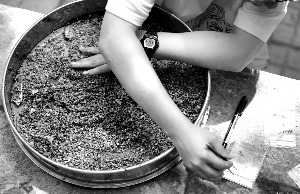 發掘人員介紹,水洗所用的兩層篩子,網眼上粗下細。