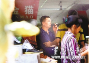 在1995年曾發生特大火災的朝天門第三交易區6區,一男子坐在自家衣褲攤前,叼根煙準備點火。老婆正在看報,出語阻止:“不要吸煙,要遭拘留。”該男子忍了約兩分鐘,終于還是把煙點起了。記者靠近拍照,女攤主機警,趕緊用身子阻擋丈夫,并出手把丈夫的煙頭打掉。