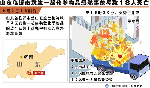 9月2日下午,山東省臨沂市蘭山區金蘭物流城F3區發生一起由裝載化學物品的貨車在卸車過程中引發的意外爆燃事故,共造成18人死亡、10人受傷。