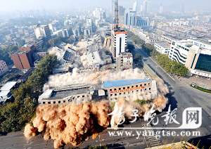 “轟轟轟”,昨天(6日)上午10時整,在猶如靈蛇的一連串紅閃過后,緊接著就是幾聲驚天動地的巨響。鎮江大市口A地塊上的京江飯店、華聯商廈和原鎮江市公安局4幢辦公大樓,瞬間土崩瓦解,黃色的塵灰如巨大的蘑菇云一般翻卷升騰,直沖藍天。在1300余名警力和數量龐大的社會力量保障下,備受矚目的“江蘇第一爆”圓滿成功。記者在鎮江國際飯店29樓內的爆破總指揮部內親歷爆破全過程,爆破后鎮江古城被漫天黃塵包圍,開始罕見的20分鐘“云中漫步”。