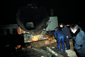 爆炸的罐車為河北牌照,車頭已被炸扁,密封的罐身已被炸得前后貫通,車前的墻壁被爆炸產生的氣浪沖倒。并排停在爆炸罐車后面10米遠的、分別掛有山東和江蘇牌照的兩輛罐車,車頭均部分損毀,罐身上“危險品”、“易燃易爆品”字跡仍清晰可見。