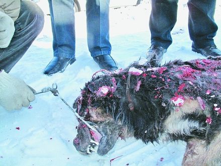 只見,父親的脖子和臉上血肉模糊,全是鮮血。脖子處,喉嚨和皮肉都沒有了,只剩下一根骨頭連著身體和腦袋;頭部、臉上已無皮肉,兩個(gè)眼珠和耳朵也不見了蹤影,頭發(fā)下面只剩一顆血淋淋的骷髏,下面白色的積雪早已被鮮血染紅,已經(jīng)與頭顱凍結(jié)到了一起。此時(shí),父親張明的身體已經(jīng)僵硬。