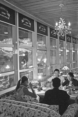 幾名青年在拉薩一個酒吧聚會,窗外能夠清楚的看見布達拉宮。 吉碼攝