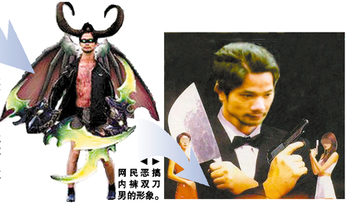 記者在某娛樂網(wǎng)站看到,有網(wǎng)友稱“那眼神、那支煙、那把刀,成就了一個(gè)憤怒的經(jīng)典,刀是哥的兄弟,煙是哥的情人”;更有甚者,稱其為“內(nèi)褲雙刀帝”,并與網(wǎng)上流傳的“曾哥”、“春哥”相提并論。