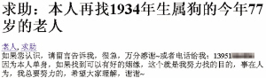 “如果您認(rèn)識(shí)1934年生屬狗的今年77歲的老人,請(qǐng)留言告訴我,很急,萬(wàn)分感謝或者電話給我:1395XXXX886。因?yàn)楸救藛紊恚绻业娇梢杂泻玫囊鼍墸@個(gè)就是我努力找的目的,事在人為,我總要努力的,希望大家理解,謝謝!”昨天,南京一女孩網(wǎng)上發(fā)帖緊急求助,網(wǎng)帖中還貼了求助人的一張照片,是一位靚麗的美女照片。開(kāi)始有網(wǎng)友以為她是在征婚,但一個(gè)80后女孩怎么會(huì)找70多歲的人呢?于是很多網(wǎng)友對(duì)此產(chǎn)生了濃厚的興趣,紛紛發(fā)帖詢問(wèn),最終了解到,這位女孩需要一位77歲老人穿過(guò)的衣服,只有找到了才能化解命中的“劫”,才能找到一位如意郎君。