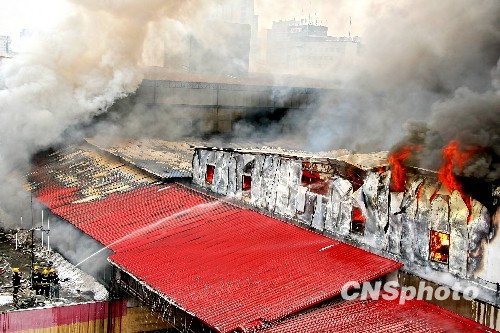 2月10日中午,中國北方最大的小商品集散中心——石家莊南三條市場床上用品商城突燃大火。消防部門稱,當日下午火勢得到有效控制,暫無人員傷亡。南三條市場地處石家莊市中心商業繁華區,毗鄰火車站,千米之外能看到市場內騰空而起的滾滾濃煙。圖為消防部門滅火現場。中新社發 翟羽佳 攝