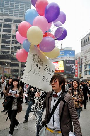 8日下午,成都春熙路中山廣場(chǎng),一名戴著墨鏡,中性打扮的女子,一手拿著氣球,一手高舉木牌“海悅哥,你在哪里?”引得路人圍觀,圍觀的人一頭霧水,并針對(duì)“海悅哥”的身份展開(kāi)了豐富的猜測(cè)。想炒作自己吧?該女子酷似李宇春,中性打扮,臉型相同,就是個(gè)子比李宇春矮,可能會(huì)因?yàn)橛幸粡埫餍悄樁呒t呢!到了待嫁的年齡想給自己相親吧?……