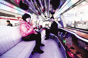 昨天的婚博會(huì)上,一輛12米長(zhǎng)的純白色加長(zhǎng)林肯“領(lǐng)航員”婚車閃亮登場(chǎng),吸引不少顧客試乘體驗(yàn)。記者坐進(jìn)去看到,車內(nèi)高度不是很高,新娘進(jìn)去要俯首,但車內(nèi)液晶電視、高級(jí)洋酒、時(shí)尚吧臺(tái)、各色杯具、高級(jí)音響、幻彩頂燈,應(yīng)有盡有,與其說(shuō)是上了車,坐定了倒更像是坐在某星級(jí)酒店的大堂吧里,車內(nèi)進(jìn)深很寬敞,便于攝像師捕捉新人“幸福難忘的一刻”。