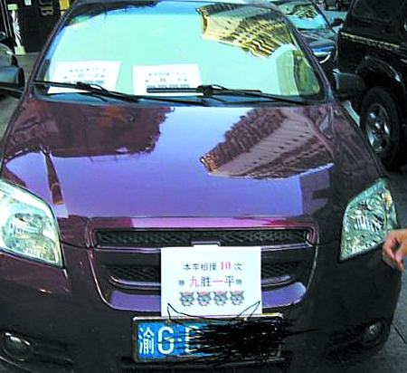 掛著“本車相撞10次,九勝一平”標語的轎車