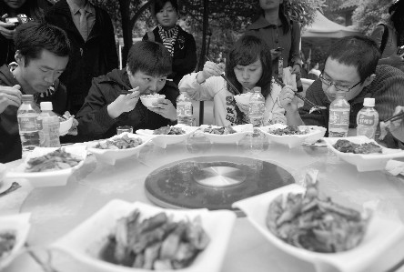 飯菜剛端上來,一桌人就開始狼吞虎咽。數(shù)分鐘后,他們又匆匆趕去下一家飯店,旋即只留下一桌殘羹冷炙……前日中午,在郫縣的5家飯店內(nèi),出現(xiàn)了這樣一群比拼飯量的人。原來,在九碗哥一炮打響后,十名網(wǎng)友報(bào)名參加成都全搜索網(wǎng)站組織的比賽,角逐“大胃王”的稱號(hào)。