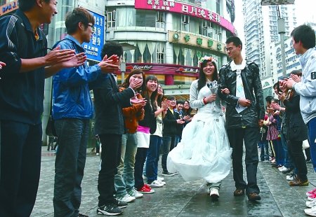 塑料袋、廢報紙、方便筷……穿成這樣舉行“婚禮”會是什么效果?昨日上午,在楊家坪步行街就上演了這樣一出特殊的“婚禮秀”,引來眾多市民駐足觀看。