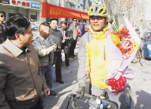 4月15日,省會市民劉建春騎著自行車,斷食騎行到上海,一路上,他只喝鹽水,不吃東西。 昨日16時30分,劉建春回到石家莊。