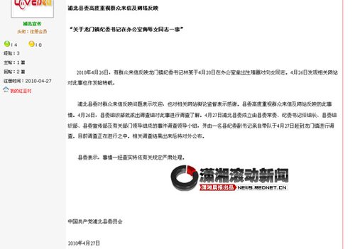 浦北縣縣委宣傳部韋副部長告訴瀟湘晨報記者,4月26日他們獲悉群眾反映龍門鎮紀委書記林某于20日在辦公室拿出生殖器對向女同志,在網上也看到了相關的帖文。浦北縣委對網上輿論監督表示感謝,高度重視群眾來信及網站反映的此事,并在27日晚上公布了縣委相關決定。