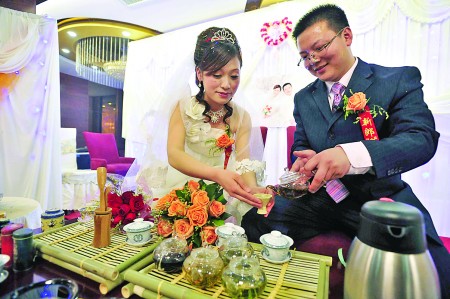 2日上午11時(shí)18分,省城無影山北路一家酒店內(nèi),在《高山流水遇知音》的樂曲聲中,一場別開生面的“茶道婚禮”正式上演。據(jù)了解,新郎和新娘都姓王,都是“80后”,喜歡追求新奇和與眾不同。五年前的一天,兩人在一家中式茶樓偶然相識(shí),彼此都喜歡茶的他們,從單純喝茶聊到了茶文化,并且越聊越投機(jī)。之后喝西式下午茶時(shí),兩人再次相遇。逐漸地,兩位茶友最終走到了一起。