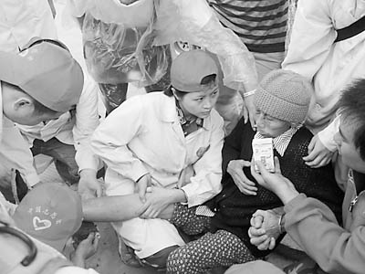 2008年四川汶川特大地震后,一名西部計劃志愿者為孤寡老人接骨。