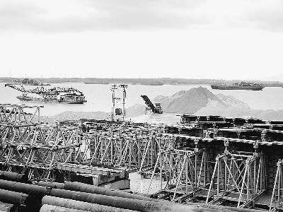 4月22日,大橋施工現場和高壓線鐵塔附近,河道非法采砂猖獗。記者 吳齊強攝