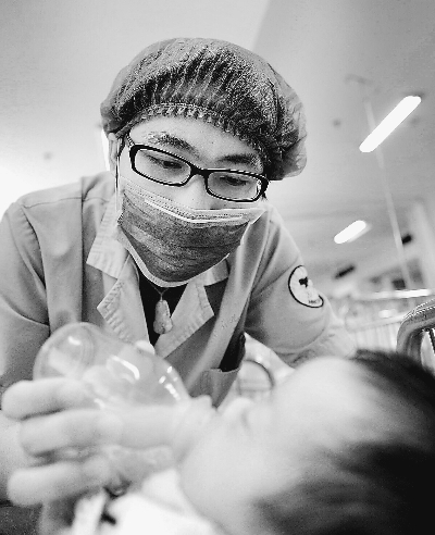 圖為湖南兒童醫院新生兒一科男護士在護理病房給寶寶喂奶(5月10日攝)。新華社記者 龍弘濤攝