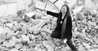 圖為5月15日,在老屋的廢墟上,郭曉蔓哭著說,她哪兒也不想去,只想要回老房子。(記者 曹樹林攝)