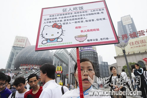 今年3月28日,回國后的鋤草在乙肝“戰友”們的支持下開始了全國乙肝紀錄片拍攝和乙肝科普宣傳的旅程,迄今走過11個城市,并在5所城市舉牌“征人吃飯”,以這種行為藝術宣傳“與乙肝感染者共餐不會被傳染”的科普知識。