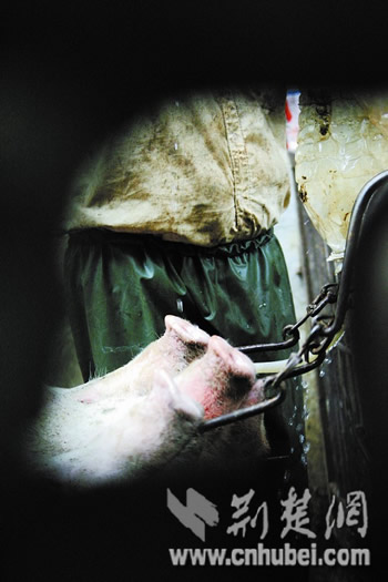 透過(guò)院墻上的一個(gè)小洞,記者看到一條給豬注水的“流水線”:有人正在一輛有上下兩層的貨車(chē)車(chē)廂內(nèi),將數(shù)十頭豬趕到院子里的豬欄;有人馬上將進(jìn)入豬欄的豬用鐵鉤鉤住下嘴唇,將豬一隊(duì)隊(duì)地掛到豬欄的一個(gè)鐵欄桿上,這時(shí),豬已動(dòng)彈不得;有人用一支大號(hào)注射器給豬打針;接著便有人將一根拇指粗、長(zhǎng)約1米的水管插入豬的嘴里,水管的一頭連接著一個(gè)5升的油壺;有人接水倒入油壺內(nèi),約5公斤的水便強(qiáng)行灌入。
