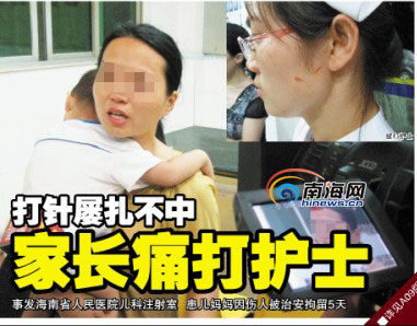5月19日傍晚,一患兒家長賈某帶1歲多的兒子到海南省人民醫(yī)院龍華門診兒科輸液室輸液時(shí),因護(hù)士2次扎針未能成功,患兒家長極為不滿,繼而對護(hù)士大打出手,造成護(hù)士人中、臉頰等多處受傷。目前,傷人的賈某已被?跒I海派出所治安拘留。