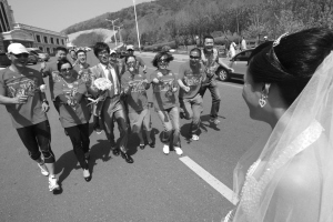 2009年4月,身體比較虛弱的趙磊為了健身加入了濱海路的長跑隊。11月,一個25歲的美麗女孩呂曉兵也加入了長跑隊,用趙磊的話說:一見鐘情就這么發生了。呂曉兵是造船廠一名行政文員,不但喜歡運動,還熱衷參與公益活動。從那一天起,每周三次的濱海路長跑被賦予了浪漫的色彩。在彼此的互相鼓勵下,今年新年全市登樓大賽,呂曉兵一舉獲得女子組第6名的佳績;在剛剛結束不久的大連馬拉松,趙磊輕松跑完半程。他們一邊奔跑一邊探討對生活的感悟,兩顆心越貼越近,終于在這個繽紛的五月,濱海路山花爛漫的時節,兩人相約走進婚禮殿堂。