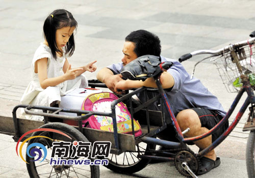 5月24日,南國都市報11版刊登的一張圖片吸引了不少市民的關注:女孩蹲在破舊的三輪車上,用手指比劃著做算術。父親蹲在三輪車旁,慈愛地看著女兒。這溫馨的一幕感動了眾多讀者和網友。網友木木留言,“大大的世界也許對這位父親而言有些難以理解,可與生俱來的父愛,讓他知道愛女兒是應該的,眼中的溫柔打動著周圍的人。父女之愛,在這一刻悄然傳遞……”這是怎樣的一對父女?25日,記者走進了他們的家。