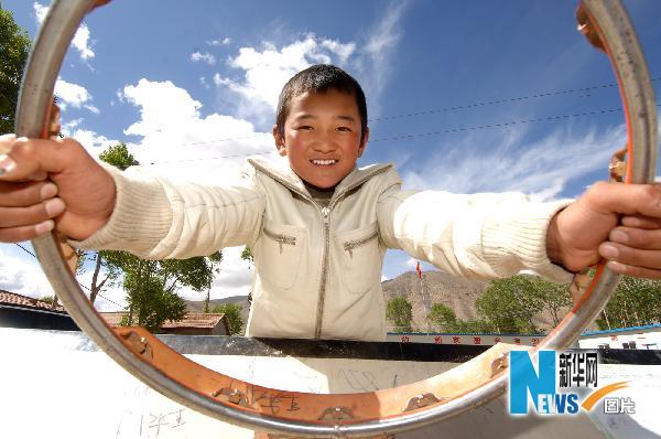 5月29日,玉樹藏族自治州孤兒板房學(xué)校學(xué)生、12歲的格求在學(xué)校操場(chǎng)上玩耍。 新華社記者 張宏祥 攝