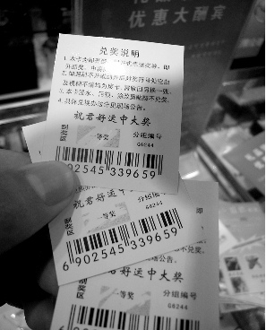 蔣先生曾被假抽獎欺騙過,通過一段時間的走訪,蔣先生發現前門大柵欄地區存在很多使用假抽獎伎倆的商家。昨天上午,記者和蔣先生一同來到前門大街,在大柵欄街上的一家工藝禮品店內,珠寶柜臺上放著一個小盤子,里面放著幾十張刮過的“謝謝惠顧”,根據蔣先生的經驗判斷,這就是一家搞假抽獎的商家。不一會兒,一對青年情侶拿著抽獎券走過來,售貨員立馬從柜臺下面拿出另一個盤子讓女孩抽取,只見女孩刮開后一聲尖叫,興奮地直跳,“我中了一等獎!”
