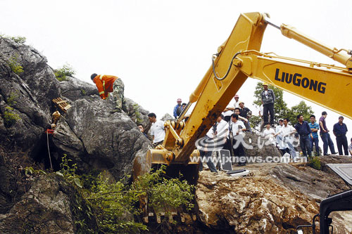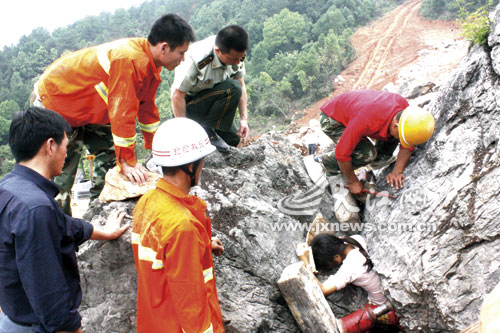 事發(fā)地十分偏僻,且沿途在修公路,交警緊急封閉道路,確保救援車輛通行。中午12時51分,救援人員抵達,但車輛無法上山頂,只好用手將鐵鋌、千斤頂、液壓破拆組合、手動破拆組合等器材搬上山。中午12時55分,救援人員到達坍塌位置,發(fā)現巨石足有30噸重,偏偏四周都是懸崖峭壁,巨石累累,專業(yè)救援器材無法放置,救援工作艱難。