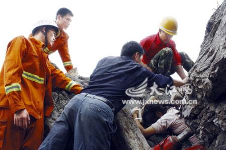瑞昌市南陽鄉(xiāng)一名年約30歲的女工正在下方鏟土,結果被死死壓在兩塊巨石縫隙中。