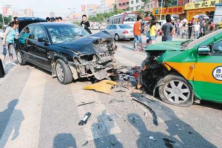 聞訊趕到的交警高新大隊民警已在事發現場豎起了警示標志,距離血跡10多米遠的馬路中央,停著迎面相撞的一輛黑色帕薩特轎車和一輛出租車,兩輛車前部都嚴重受損,帕薩特身后還停著一輛面包車,該車駕駛室一側后輪被撞壞。車頭嚴重變形的出租車身后則停著另一輛出租車,目擊者說,由于避讓不及,這輛出租車撞在了前面那輛出租車上。