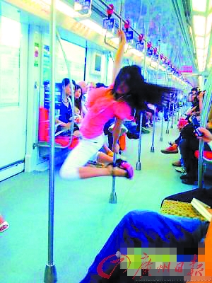 有意思的是,記者發現,面對如此精彩的表演,車上乘客神態各異,有的男乘客大聲叫好鼓掌“哇,高難度啊!太專業了!”有的乘客專門換位走過來觀看表演,更多的乘客則拿起手機狂拍,但也有乘客很“淡定”,完全當女郎透明,看書看報紙下車,該干嘛還是干嘛,也有的乘客雖然看著女郎,但臉上沒有絲毫表情,令人忍俊不禁。
