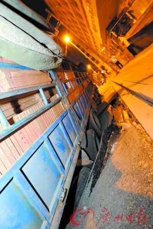廣州街頭驚現“天坑”?前天晚上10時許,一輛大貨車在行經工業大道珠江醫院對開路面時突然陷入一個約莫10平方米大小的坑中。有目擊者推測說,貨車下陷的路面最近剛剛鋪過一層瀝青,承重能力不強導致意外,也有人認為是因為貨車涉嫌超載,才會把路面壓塌。
