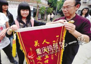 學校校長將老人家屬送來的錦旗轉交給小黃。冉文攝(圖片來源:重慶晚報)